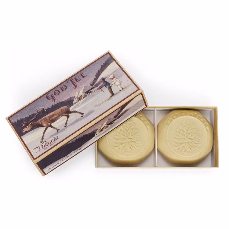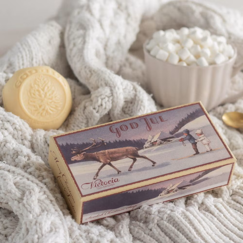 Ljuvliga stora tvålar som sprider julkänsla även i badrummet. Tvålarna tillverkas av Kungliga hovleverantören Victoria Scandinavian Soap i Skåne med anor från 1914. Tvålstansarna är från 30-talet och används än idag. De bedårande askarna med gamla svenska julmotiv och dofterna är typiska för svensk jul. Välj mellan motiven Tomte, Barn i kälkbacken eller Ren.