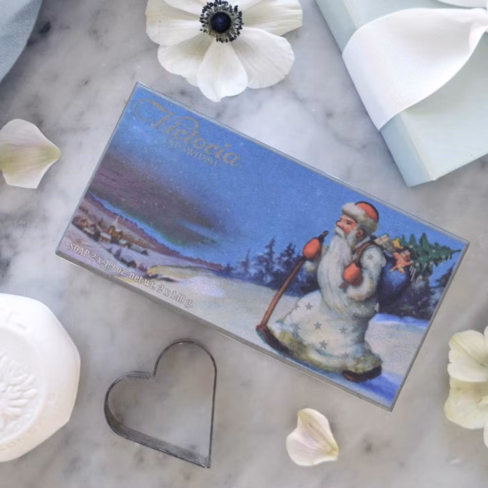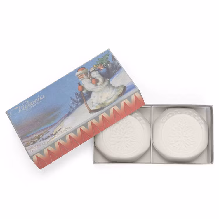 Ljuvliga stora tvålar som sprider julkänsla även i badrummet. Tvålarna tillverkas av Kungliga hovleverantören Victoria Scandinavian Soap i Skåne med anor från 1914. Tvålstansarna är från 30-talet och används än idag. De bedårande askarna med gamla svenska julmotiv och dofterna är typiska för svensk jul. Välj mellan motiven Tomte, Barn i kälkbacken eller Ren.