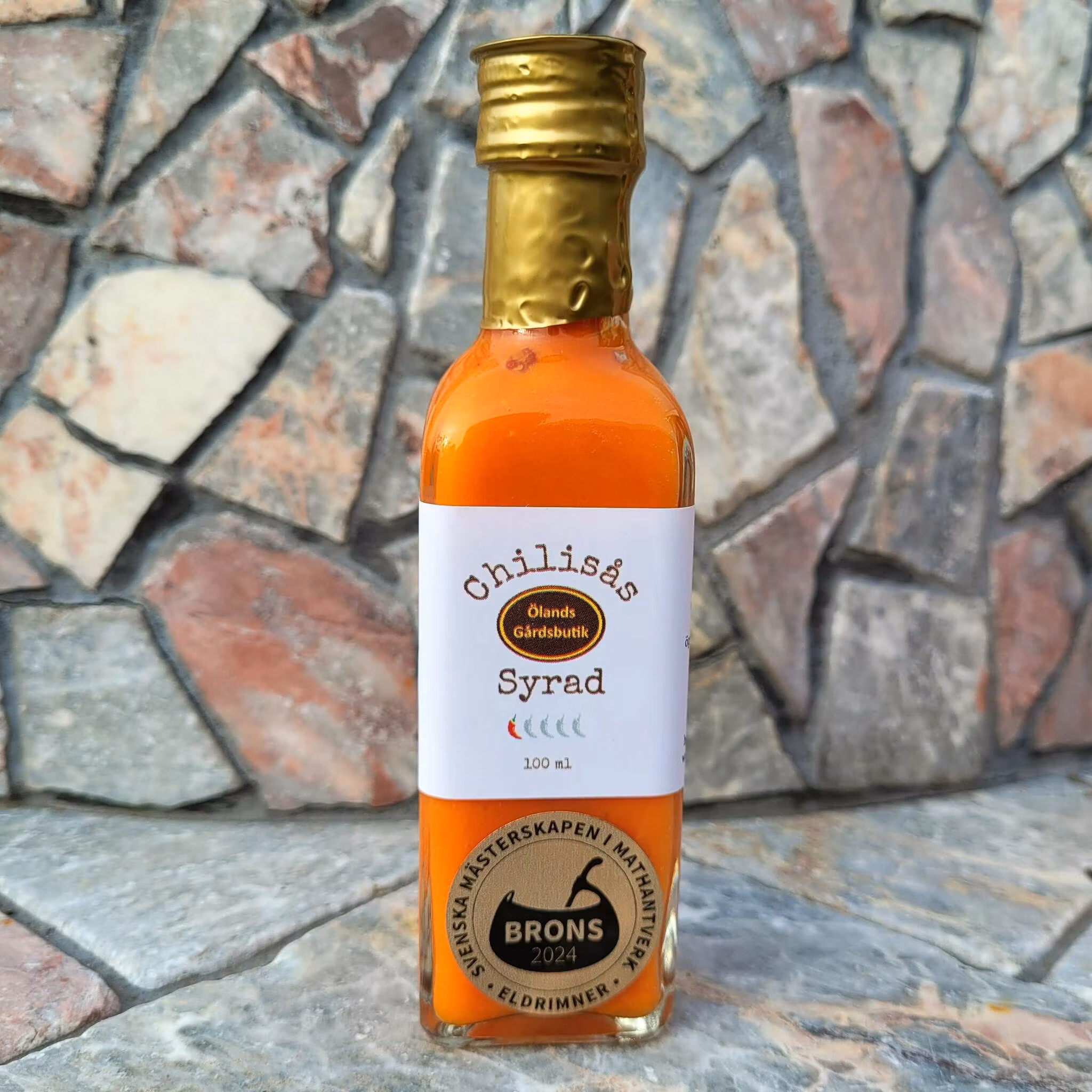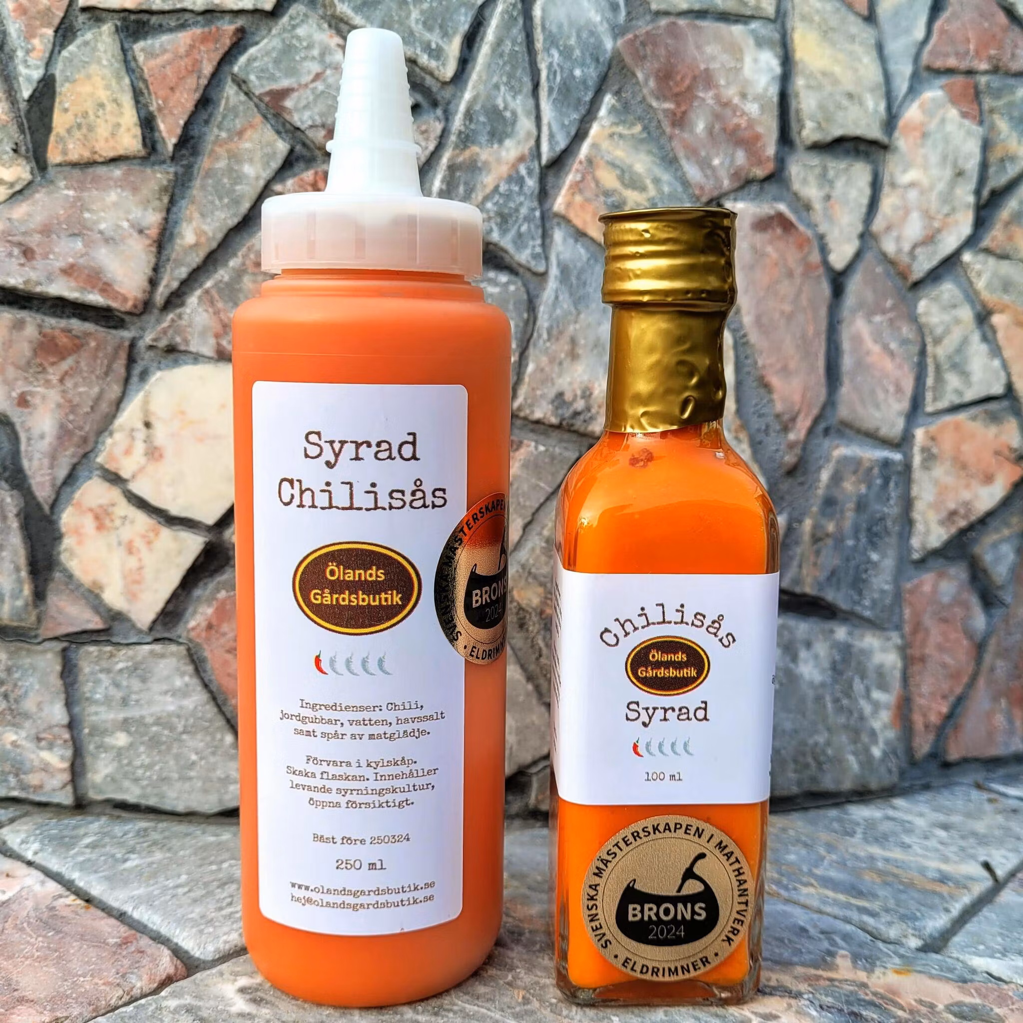 Här har vi en riktigt fräsch syrad chilisås med två olika sorters chili och jordgubbar från våra egna odlingar. Tilldelades en bronsmedalj i SM i Mathantverk 2024!