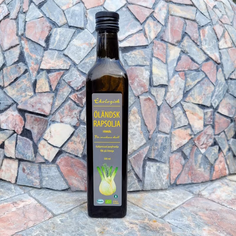 Nyhet sommaren 2024 - Öländsk rapsolja med smak av fänkål. Smaken är framtagen i samarbete med stjärnkocken Karin Fransson.