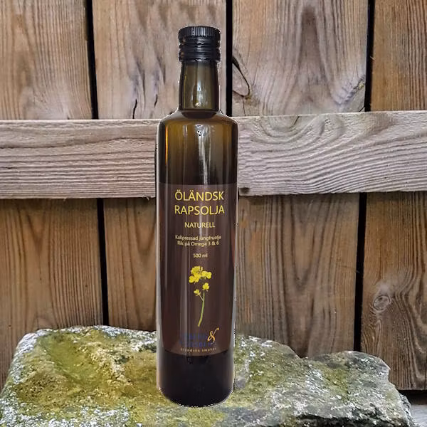 Av de gula rapsfälten som lyser upp vår vackra ö under våren och försommaren pressas oljan droppe för droppe under låg temperatur. Det gör att oljan behåller sin fina smak och behåller innehållet av vitaminer, omega 3 och omega 6.